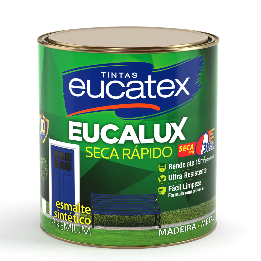 Esmalte da linha Eucalux, acabamento acetinado, cor branca, embalagem de 900ml. Indicado para uso interno e externo com ótima cobertura.