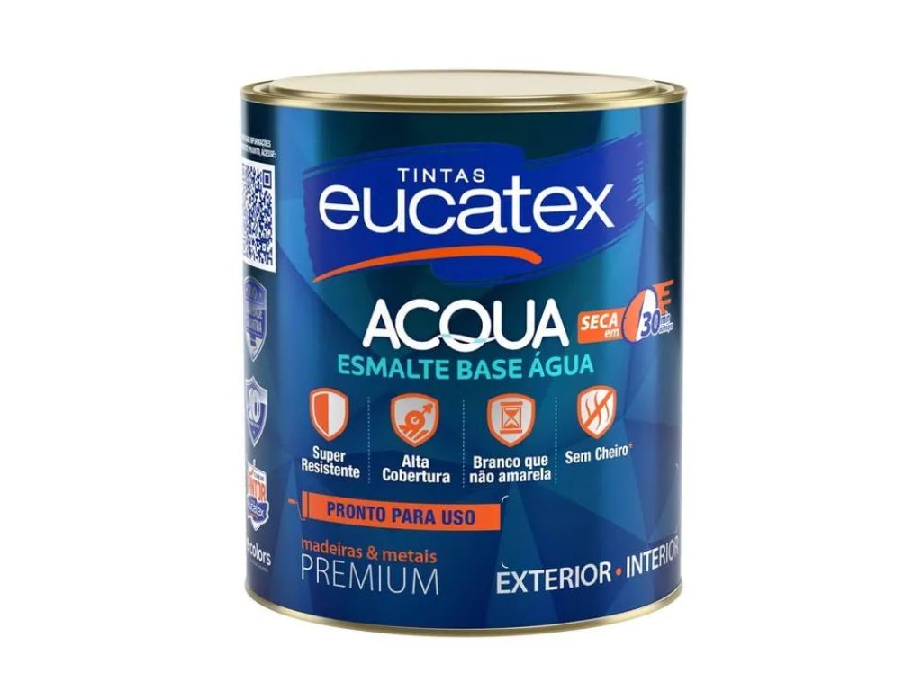 Esmalte acrílico Eucatex Acqua na versão branco acetinado, embalagem de 900 ml. Ideal para revestimentos de madeira, metais e alvenaria, com baixo odor, secagem rápida e acabamento uniforme e resistente.